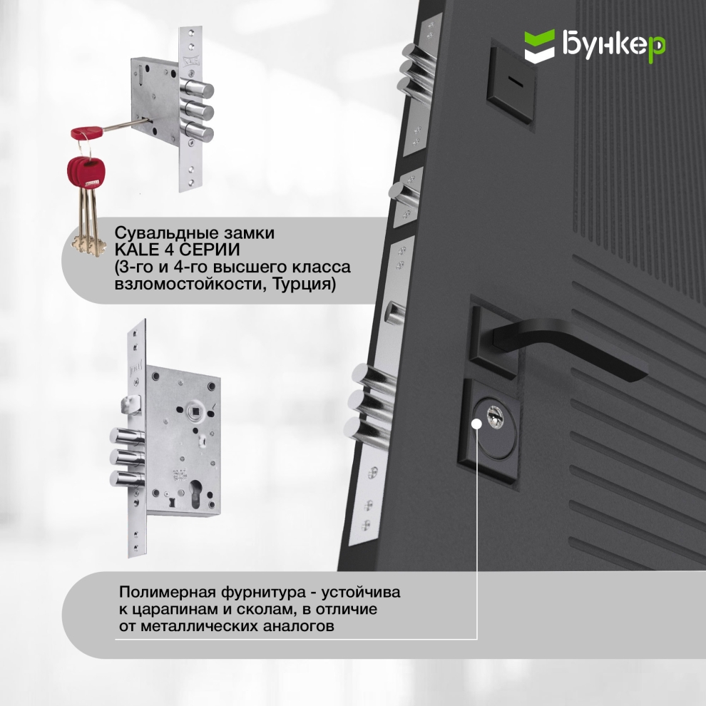 - Черная матовая (полимерная): Цилиндровая накладка, сувальдные накладки со шторкой 2 шт, ночная задвижка, ручка, глазок, цилиндр ключ-вертушка (производитель не регламентируется)